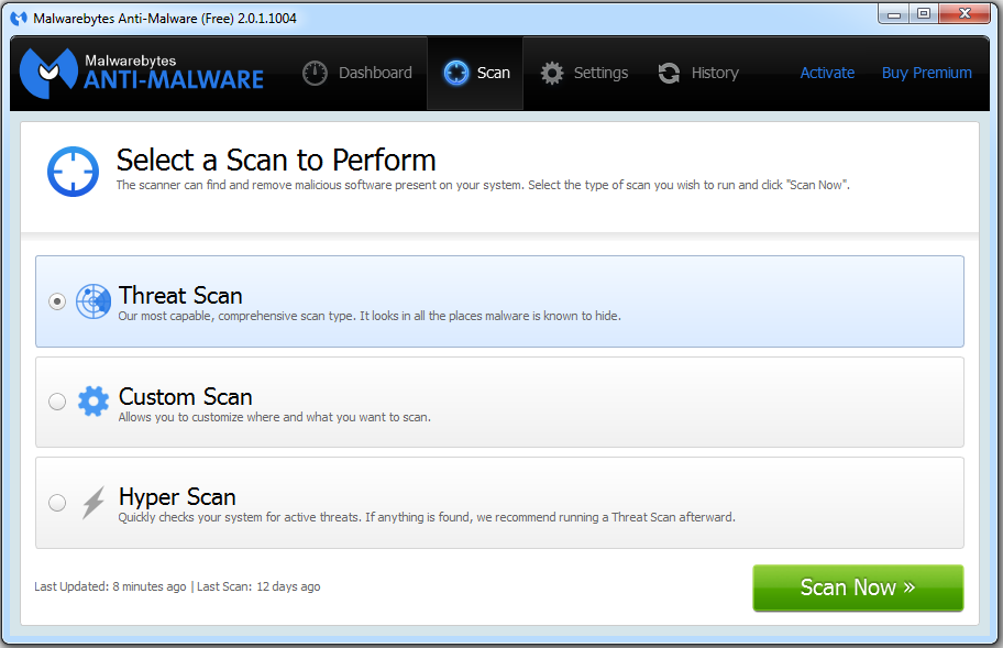 Über die Programmoberfläche kann der Nutzer einen Systemscan starten, indem er auf "Scan Now" klickt. Nun wird das System durchsucht, wobei der Nutzer den Systemscan jederzeit anhalten kann, auch wenn nicht das gesamte System gescannt wurde. Darüber hinaus ist es möglich, nur bestimmte Teile des Computers mit dem Modus "Custom Scan" zu durchsuchen. Dadurch verringert sich die Suchzeit des Scanvorgangs. Der schnellste Scanvorgang kann mit dem Modus "Hyper Scan" gestartet werden. Hierbei werden jedoch nur aktive Areale durchsucht, in denen sich Malware gerade aufhalten könnte. Verzeichnisse von Programmen oder Ordner, in denen sich Daten und Downloads befinden werden dagegen nicht durchsucht.