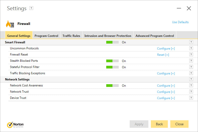 Die Norton Security Software enthält eine eingebaute Firewall, welche ankommende und ausgehende Prozesse des Computers überwacht und den Nutzer des Computers dazu befähigt, diese Prozesse zu kontrollieren. Wenn ein bestimmter Prozess oder ein bestimmtes Programm nicht ins Internet gelangen soll, kann der Nutzer von Norton über die Firewall diesen Prozess daran hindern.
