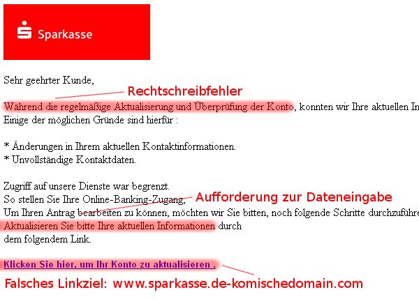 Zudem verschicken Banken und auch andere Anbieter niemals E-Mails, in denen Sie aufgefordert werden, die Zugangsdaten zur "Sicherheit" noch mal einzugeben. Auch das Linkziel hat bei Phishing-Mails immer einen Zusatz, der verdächtig ist: "www.sparkasse.de-komischedomain.com" ist nicht die Adresse der Sparkasse! Dies ist die Adresse von de-komischedomain.com mir der Subdomain "www.sparkasse". Das ist was völlig anderes!