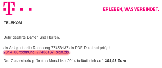 Gerade der letzte Punkt ist wichtig: Datei-Anhänge die mit ".exe" oder ".zip" enden oder sonst als "Ausführbare Datei" geöffnet werden sollen, sind fast immer Viren. Daher lassen Sie die Finger im Zweifel davon und öffnen Sie den Anhang nicht! Auch wenn die Mails scheinbar die letzte Telekom-Rechnung enthält, sollte vorher immer geprüft werden, ob das auch tatsächlich so ist.