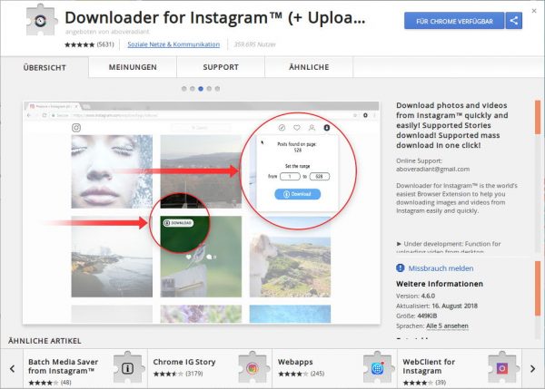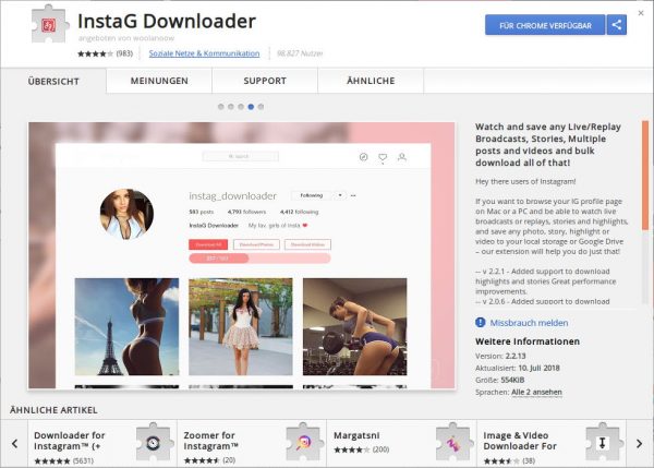Die Extension Downloader for Instagram für den Chrome Browser ist eine besonders elegante Möglichkeit, Bilder und Medien von Instagram zu downloaden. Sie wird genau wie jede andere Extension für Chrome installiert, d.h. die Installation dauert normalerweise weniger als 1 Minute. Anschließend erstellt die Extension einen eigenen Download-Button, den man per Rechtsklick auf das gewünschte Posting aufruft. Darüber hinaus gibt es sogar die Möglichkeit, alle oder mehrere Medien eines Profils auf einmal herunterzuladen.