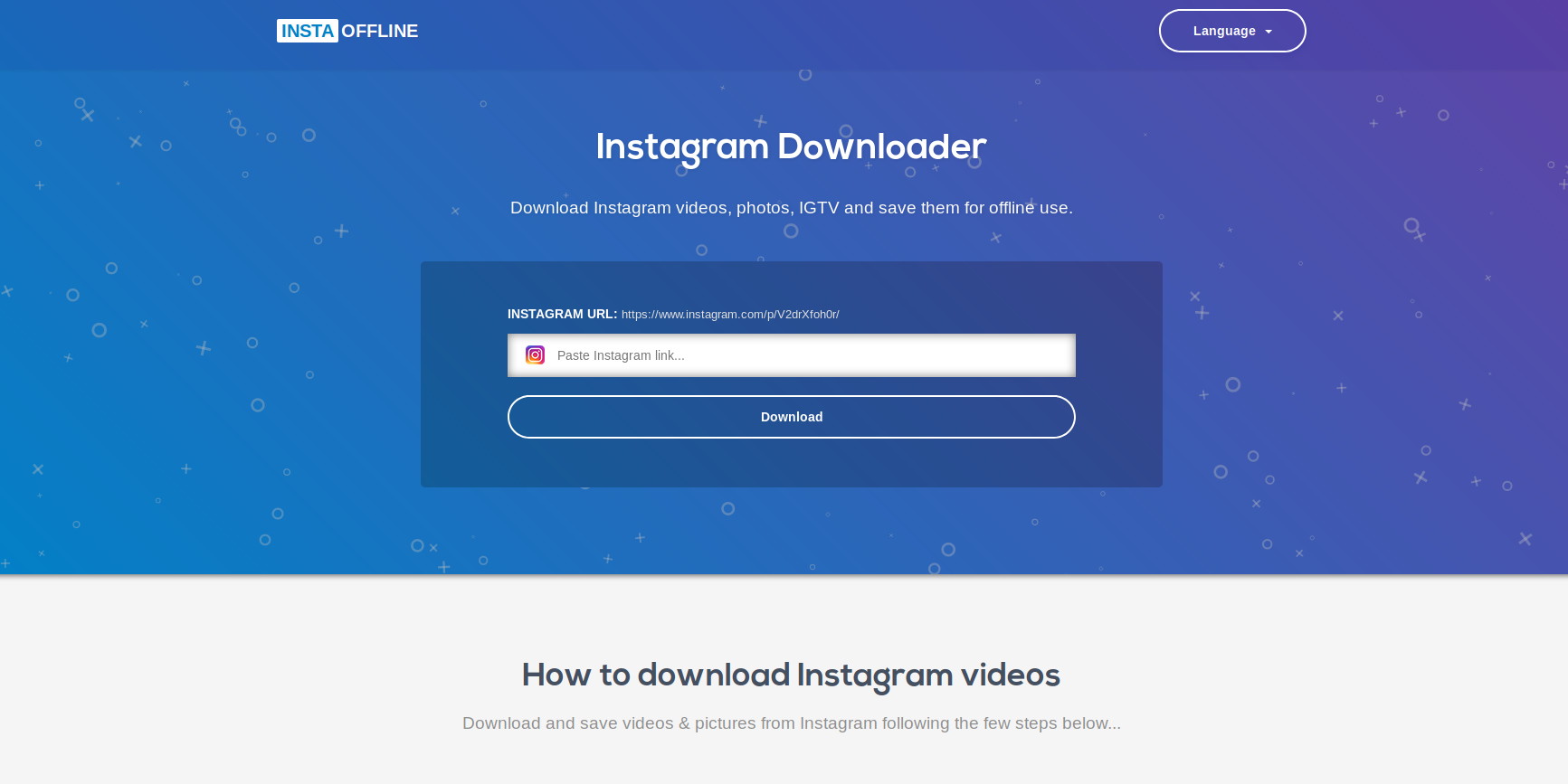 InstaOffline.net bietet ebenso wie DownloadGram eine Online-Download-Möglichkeit, ohne dass eine Extension installiert werden muss. Man ruft einfach die Webseite auf und kopiert die URL des Bildes oder Videos von Instagram in das Eingabefeld. Mit einem Klick auf den Download-Button kann man dann das Bild oder Video herunterladen.