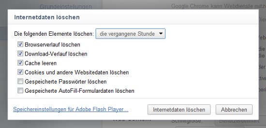 Hier kann man den Browser-Verlauf, die Download-Chronik, Formulardaten, Cache oder Cookies löschen. Hierbei kann man ähnlich wie bei Firefox auswählen, ob man dies nur für einen bestimmten Zeitraum oder komplett machen will. Es ist also kein Problem die meistbesuchten Seiten in Chrome zu löschen. Wer gar nicht erst will, dass ein Verlauf angelegt wird, der kann auch im Inkognito-Modus surfen. Diesen erreicht man per Tastenkombination Strg+Shift+N oder über das Menü.