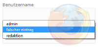 Manchmal möchte man aber auch nur ganz bestimmte Werte der gespeicherten Formulardaten löschen. Dies ist zum Beispiel der Fall, wenn man im Feld für einen Benutzernamen versehentlich das Passwort eingegeben hat. Das Passwort würde nun immer wieder im Klartext angezeigt werden, wenn man wieder etwas in das Feld eintippen würde. Da man unter Umständen aber die anderen Formulardaten in dem Feld für den Benutzernamen nicht löschen möchte, ist eine Funktion für das Löschen einzelner Formulardaten erforderlich. In Firefox kann man dies über die Taste Entf machen, d.h. man wählt den betreffenden Wert aus der DropDown-Liste aus und entfernt diesen mit dem Drücken auf die Entfernen-Taste.