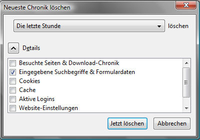 Um zu sehen, welche Daten zu einem Formularfeld gespeichert sind, bringt man den Fokus in das betreffende Feld und drückt die "Nach unten"-Pfeiltaste. In der DropDown-Liste stehen nun alle gespeicherten Formulardaten zu diesem Feld. Mit der Pfeiltaste oder der Maus kann man den Fokus auf den zu löschenden Eintrag legen. Nun genügt der schon erwähnte Tastendruck auf Entfernen und der falsche Eintrag ist gelöscht.