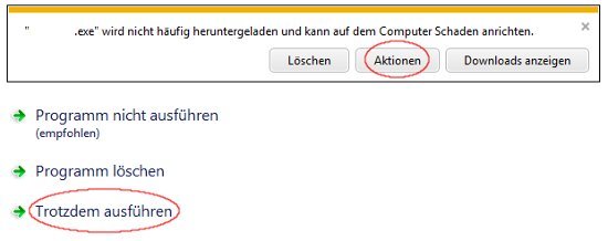 Zunächst muss man die Setup-Datei von Firefox herunterladen. Nach einem Klick auf den entsprechenden Download-Button startet der Download eigentlich automatisch. Hier könnte es allerdings auch schon die ersten Hürden geben, denn je nachdem mit welchem Browser man den Download aufruft, muss man den Download bzw. die Ausführung des Setups manuell freigeben. Ist man z.B. mit dem Internet Explorer unterwegs und hat man den SmartScreen-Filter aktiviert, dann warnt der IE vor Dateien, die er erst mal nicht kennt. Daher muss man im Internet Explorer den Download manuell freigeben, dies kann man bei dem "Warn"-Hinweis über den Button Aktionen -> Trotzdem ausführen machen.