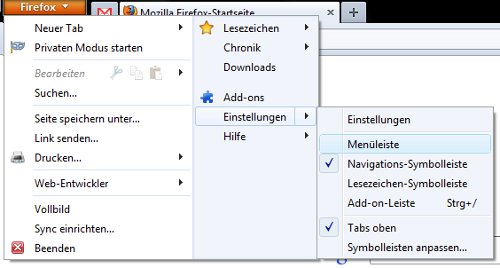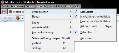 Wenn man die Änderung wieder rückgängig machen möchte, oder wie bei manchen Linux-Varianten des neuen Firefox, die Aktionsschaltfläche noch gar nicht sichtbar ist, dann kann man dies über das alte Menü machen. Hierzu den Punkt Ansicht -> Symbolleisten -> Menüleiste abwählen. Anschließend verschwindet die Menüleiste wieder und die neue Aktionsschaltfläche wird sichtbar.