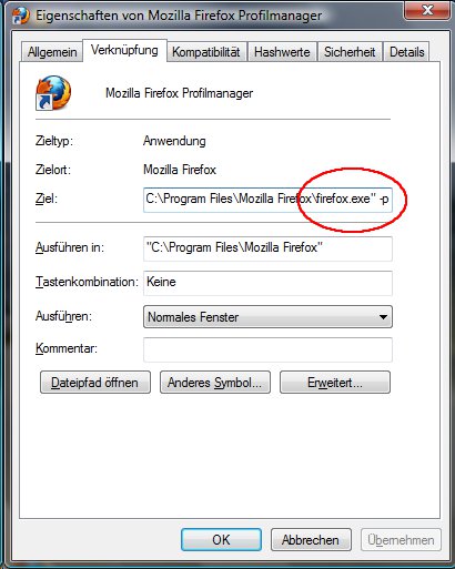 Mit der rechten Maustaste wählt man die Eigenschaften des Shortcuts aus. Im Feld "Ziel" steht der Pfad zur firefox.exe drin. Hinter diesem Pfad fügt man den Zusatz "-p" ein (ohne die Anführungszeichen). Danach kann man den Firefox Profilmanager mit einem Doppelklick auf den Shortcut starten.