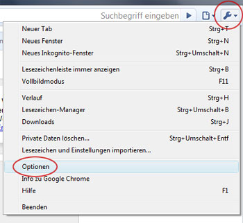 Dieser Schritt ist optional und nicht zwingend erforderlich. Sollten Sie bereits die aktuelle Version von Chromium nutzen, können Sie mit dieser kurzen Anleitung ihre persönliche Startseite einrichten. Hierzu Chromium starten. In der rechten oberen Ecke auf das Symbol mit dem Werkzeugschlüssel klicken (siehe Grafik) und den Menüpunkt "Optionen" auswählen.
