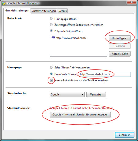Im nachfolgenden Dialog als Homepage http://www.startxxl.com/ hinzufügen und ggf. Chrome noch als Standardbrowser festlegen.