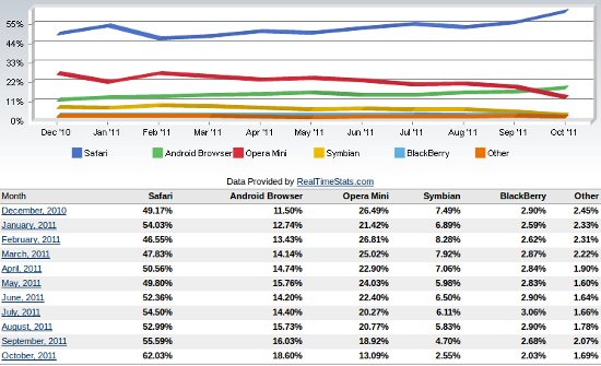 Eigentlich ist es keine allzu große Überraschung, denn laut der jüngsten Studie von Net Marketshare hat der ins Android Betriebssystem eingebaute Browser den Opera Mini Browser inzwischen überholt. Opera hatte bislang im Bereich der Smartphones einen Anteil von ca. 25%, dieser Wert ist allerdings in den letzten Monaten drastisch auf 13% gefallen. Der Android Browser konnte hingegen von vormals 15% auf 18,6% zulegen. Der Platzhirsch in diesem Segment ist aber nach wie vor der Safari Browser von Apple. Dieser kann vor allem dank der Marktdominanz von iPhone und iPad mehr als 60% Marktanteil vorweisen. So wie früher Microsoft den Internet Explorer mit Hilfe von Windows zum Marktführer gemacht hat.