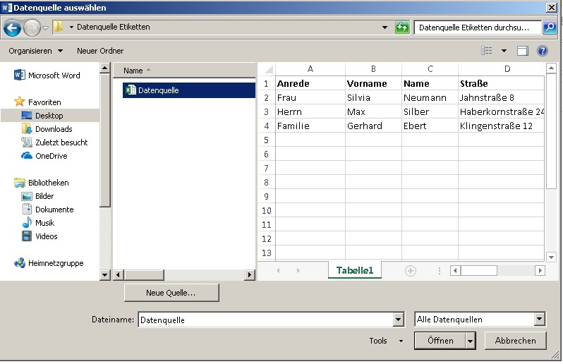 Datenquellen können Sie mit unterschiedlichen Programmen erstellen. Word bietet eine eigene Funktion "Datenquelle" an. So können Datenquellen direkt über das Hauptdokument (dem Dokument, in dem die Adressetiketten angelegt werden) angelegt werden.