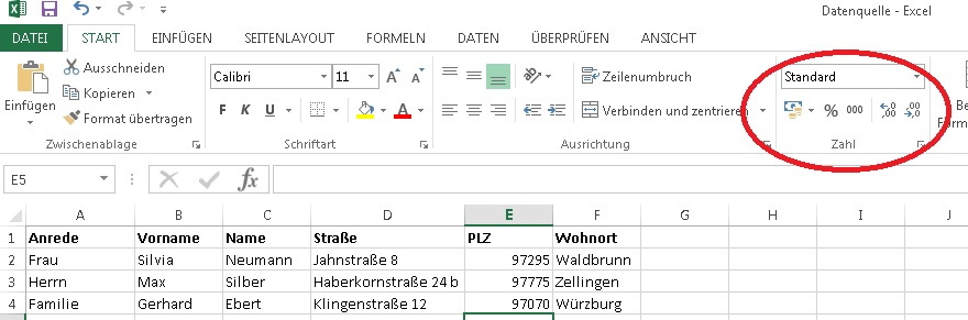 - Eingeben der Daten: Hierbei ist darauf zu achten, dass die einzelnen Zellen unterschiedliche Formate zugewiesen bekommen können – Währung, Datum, etc. Damit die Adressen richtig dargestellt werden, muss das Zellformat mit "Standard" eingestellt sein.